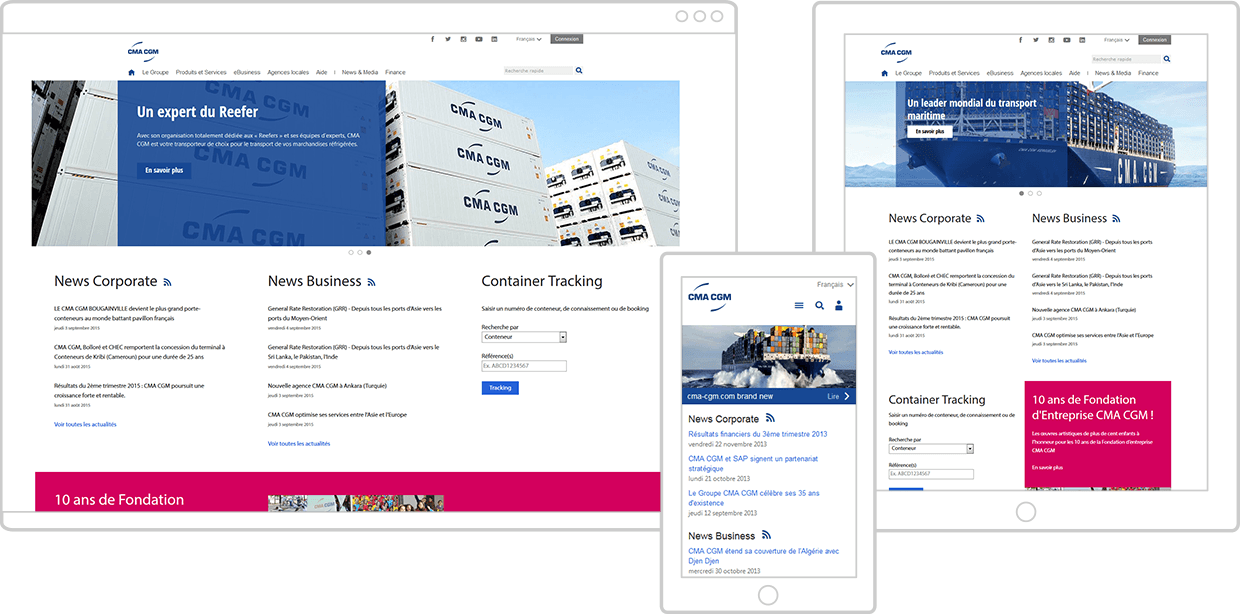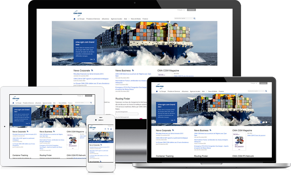 Le Groupe CMA CGM a souhaité refondre son site institutionnel et sa nouvelle plate-forme eCommerce (eBusiness). Le site rassemble les filiales du transport du Groupe (CMA CGM, DELMAS, ANL, CNC et USLines) et offre également de nombreuses nouvelles fonctionnalités.